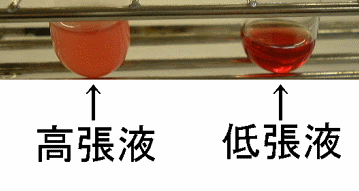 顕微鏡での観察ではなく、試験管を肉眼で観察したときには、両者の違いは明らかです。高張液側では血球中に赤い色があるために不透明になっていますが、低張液側ではおそらく溶血にる赤血球内容物の吐出によると思われる透明な赤色をしています。従って、溶血がおこっていることは確からしいのですが、顕微鏡での観察では確認できなかったのです。