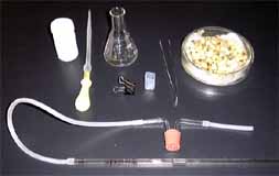 三角フラスコ、ゴム栓、L字型ガラス管2本、ゴム管2本(30cm、6cm)、メスピペット(2ml)、