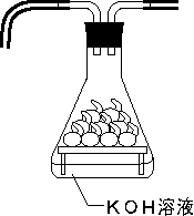 また、多くの図説では、アルカリを入れたフラスコと入れないフラスコの2つを用いて同時測定し、気圧変化の差を比較している図が掲載されているが、同じフラスコで2度測定した結果でなければ、意味はないはずである。本来、容器内の二酸化炭素は底の方にたまるので、今回のように種子と同じ高さにアルカリの容器を設置するのは、二酸化炭素ガスの吸収効率が悪い。できれば、あらかじめ、何らかの台を容器内に入れておき、その上に種子を置くようにするのが最もよい方法である(図)。