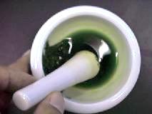 - シロツメクサの葉をちぎって乳鉢に入れ、乳棒で軽く押しつぶす。アセトン10m1を加え、さらに押しっぶして色素を抽出する。このとき、葉をすりっぶすのではなく、押しつぶして色素を抽出したほうが良い(fig.10)。