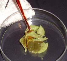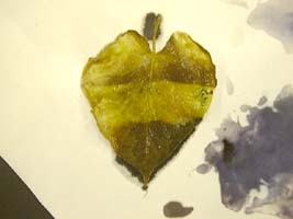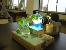 - 工タノールでクロロフィルを抜いた葉を、ヨウ素ヨウ化カリウム液につけると(fig.6)、写真のネカを通して光が当たった部分だけが光合成を行って同化デンプンを作り出し、ヨウ素ヨウ化カリウム液と反応してネガの絵柄が現れるはずだったが、うまくいかなかった。