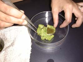 - ヘチマやワタの葉は方法の3の段階で、葉がパリパリに堅くなってしまいうまくいかなかった(fig.9)。材料とする葉の検討、葉を熱湯でゆでる時間や、エタノールでの脱色の程度などの検討が必要だと思われる。