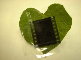- 緑葉が光合成でっくりだした同化デンフンをヨード液で染める方法を利用して葉っぱに写真のネガをプリントする。