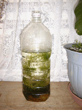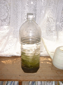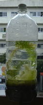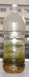ペットボトルの中に、「空気、水、土、オオカナダモ、ミジンコ」が入っています。